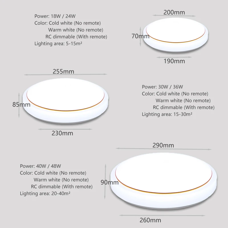 1: Our products have three options: RC dimmable, warm white and cold white. They have the same appearance and different configurations inside.