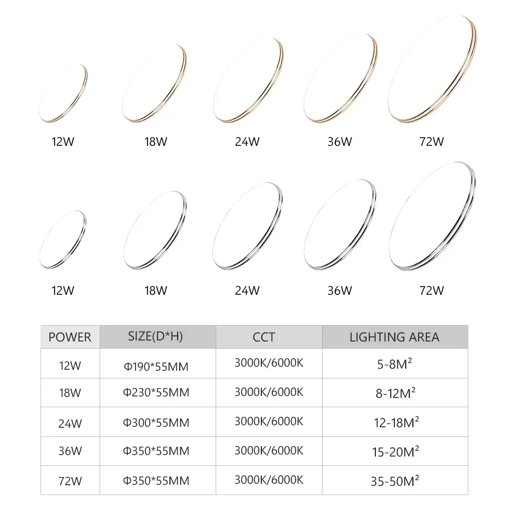 Model Power Color Temperature Inner Dia. /Mount Size Thickness Dual Silver Line/ Dual Gold Line PK2146/PK2147 12W Cool White 190mm/7.48" 5.5cm/2.17" PK2104/PK2105 18W Cool White 230mm/9.05" 5.5cm/2.17" PK2107/PK2108 24W Cool White 300mm/11.81" 5.5cm/2.17" PK1616/PK1615 36W Cool White 350mm/13.78" 5.5cm/2.17" PK1616/PK1615 72W 3 Modes White-Warm-Neutral 350mm/13.78" 5.5cm/2.17"