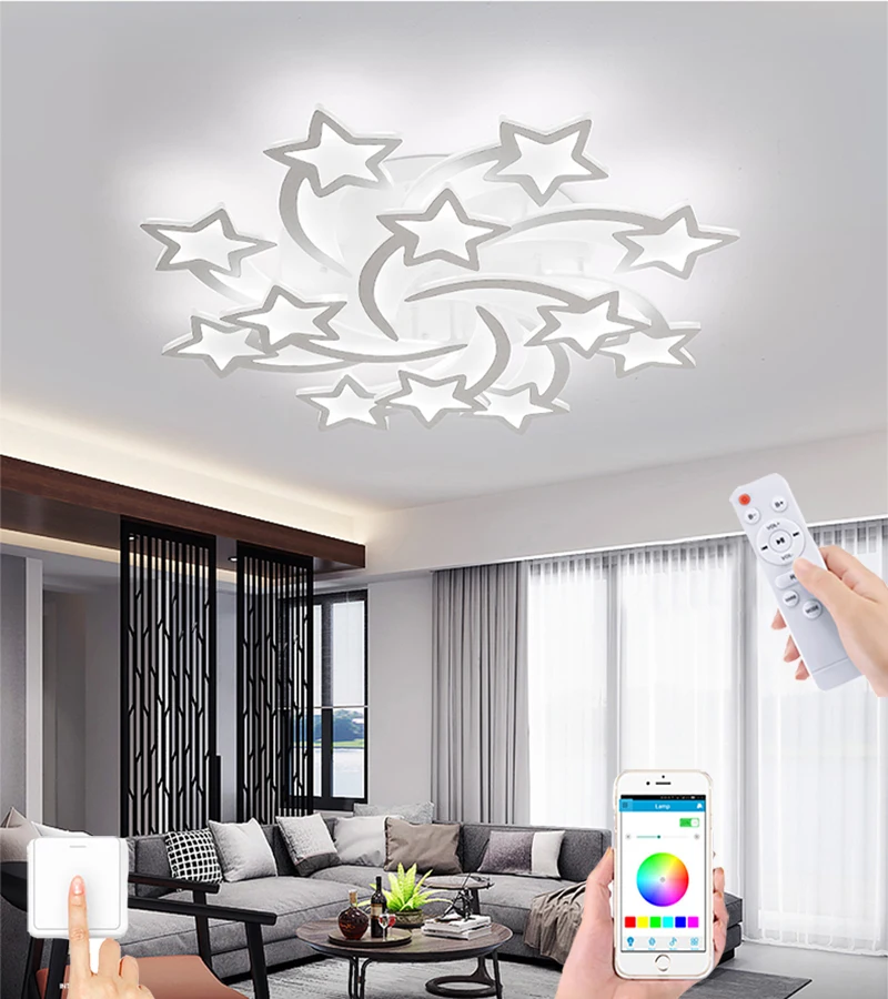 Люстра представляет собой приложение для мобильного телефона с дистанционным управлением затемнением, с белым светом, нейтральным светом, теплым светом.