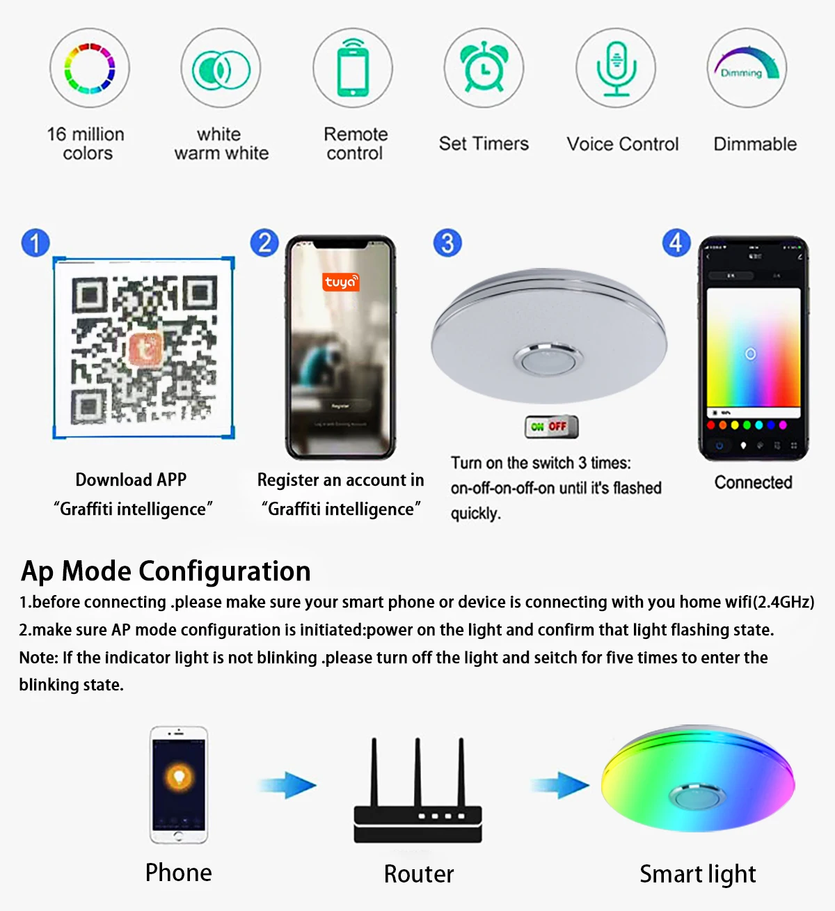 2) Timing: The smart light is automatically turned on and off at a given time through the timer function, auto light and auto music.