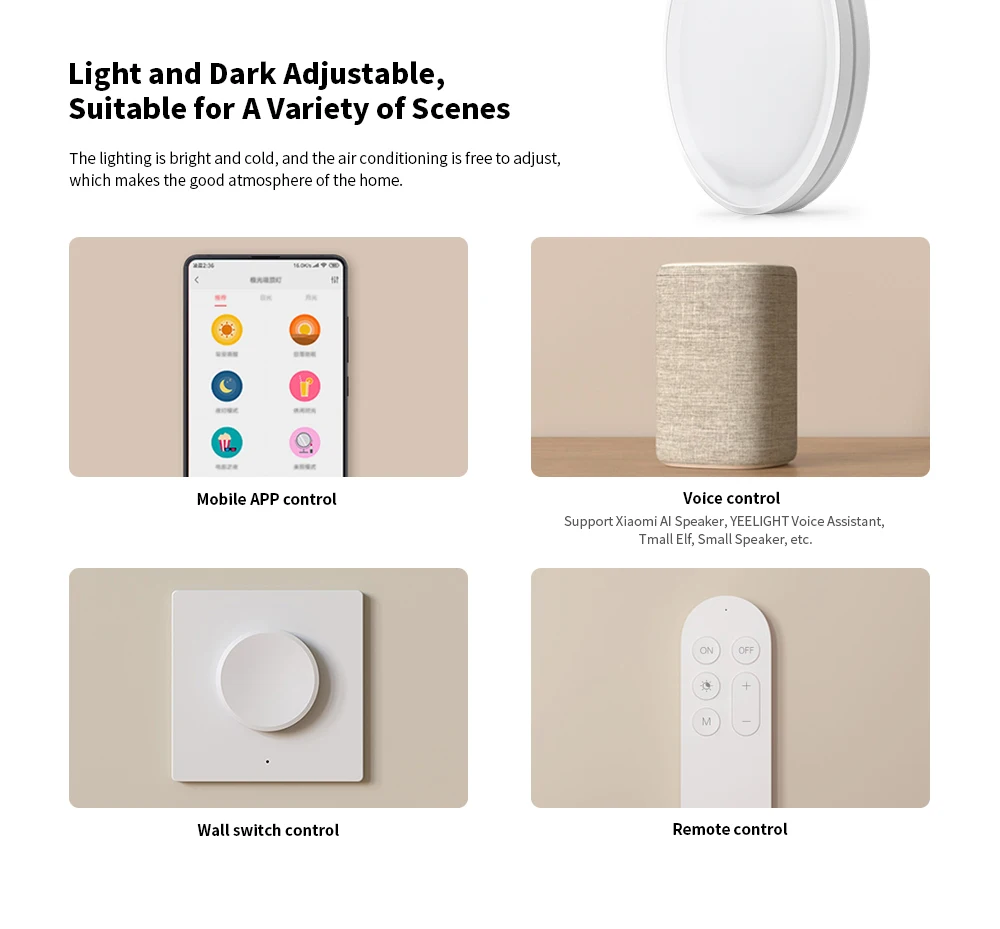 Mobile APP control, voice control, support Xiaomi AI Speaker, YEELIGHT Voice Assistant, Tmall Elf, Small Speaker, etc. wall switch control, remote control